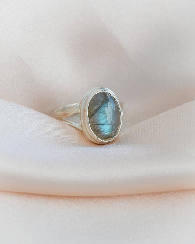 A gema de Labradorite está completamente rodeada por prata, o que proporciona proteção ao cristal no seu uso diário.