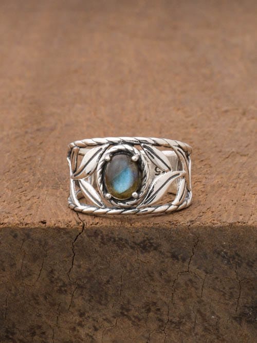 Anel em Prata e Labradorite, concebido artesanalmente com cristal natural. O anel é adornado lateralmente com folhas.