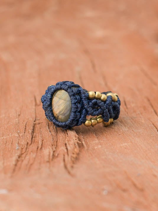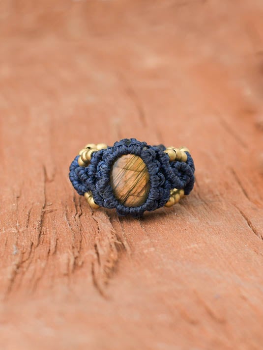O Anel macramé Galla é concebido artesanalmente com Labradorite de qualidade superior.