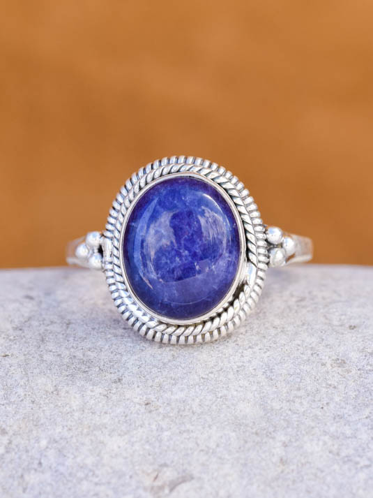 Materiais: Prata 925 e cristal de Sodalite. Cristal opaco de cor azul, lapidado em forma oval.
