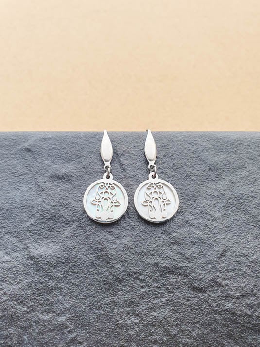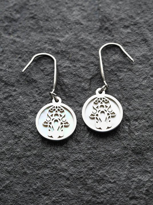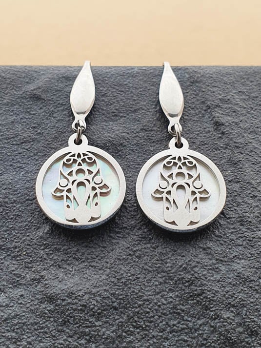 Brincos Hamsá, em aço inoxidável e madrepérola. Par de brincos longos, com um design feminino e original.