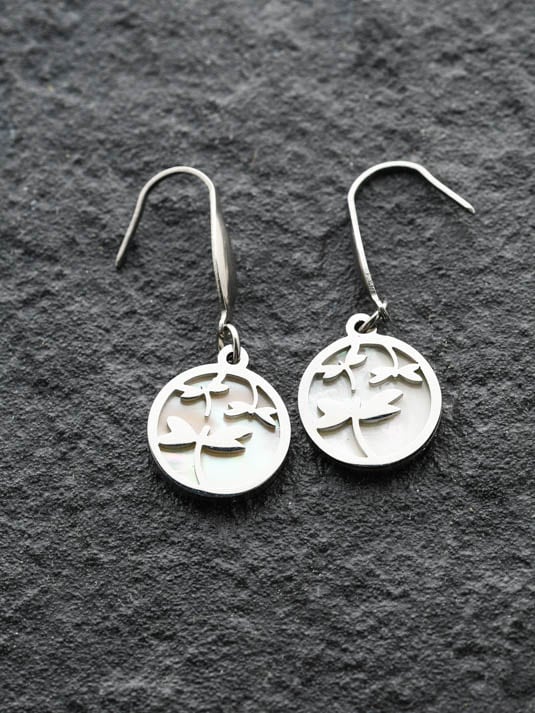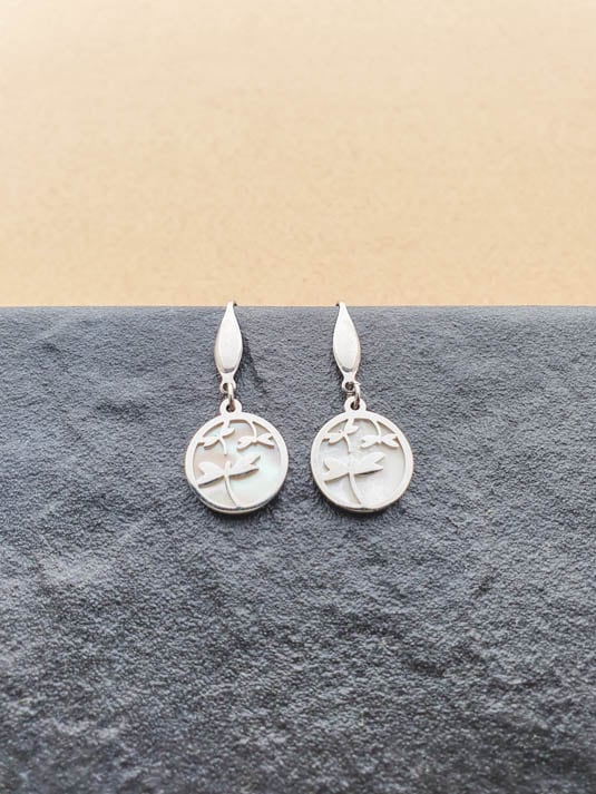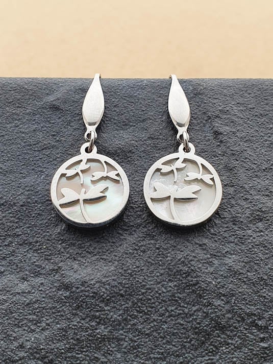 Brincos Libelinha, em aço inoxidável e madrepérola. Par de brincos longos, com um design feminino e original.