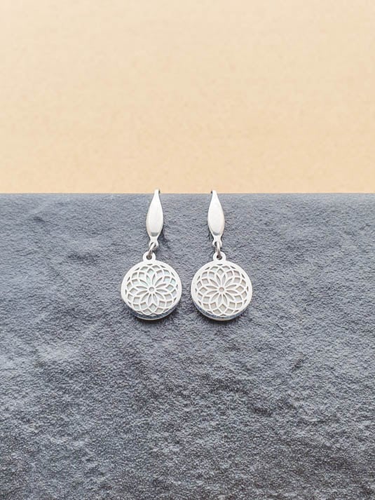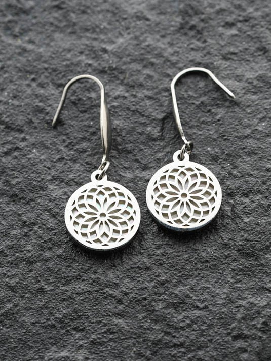 Brincos Mandala, em aço inoxidável e madrepérola. Par de brincos longos, com um design feminino e original.