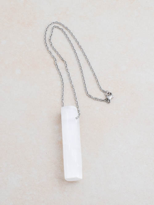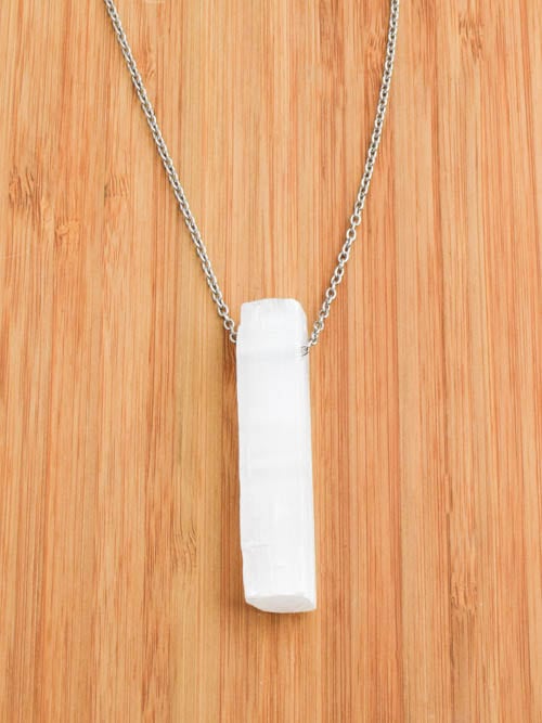 Colar Barra de Selenite, concebido com corrente de aço inoxidável e a pedra em bruto.