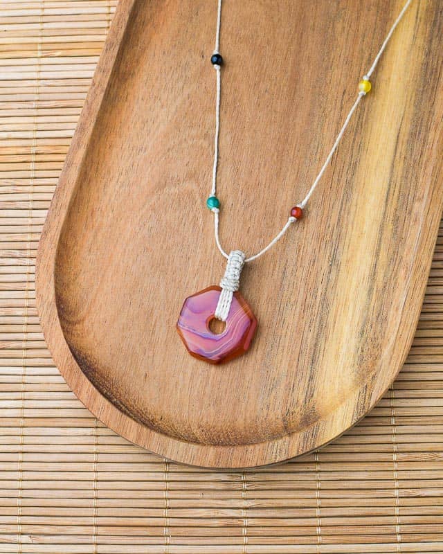 Criado com técnicas de macramé, o colar Hopi tem como peça central, um encantador pendente octogonal de Ágata.