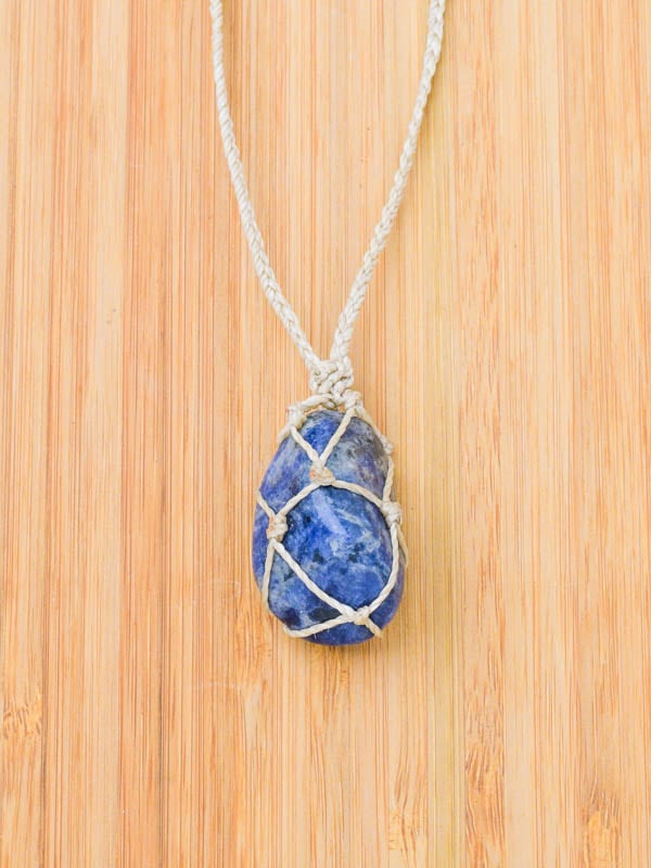 Colar Koan Sodalite, concebido artesanalmente com técnicas de macramé.