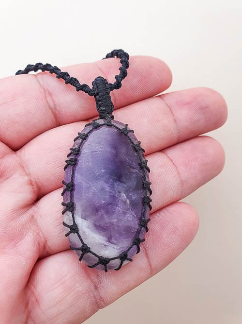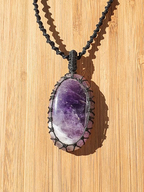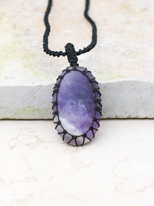 O colar Namaste Ametista é concebido no nosso atelier, de forma artesanal, com técnicas de macramé.