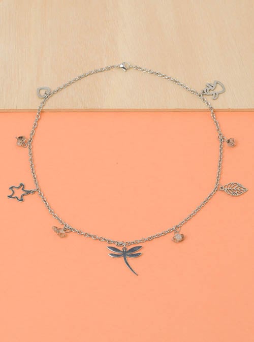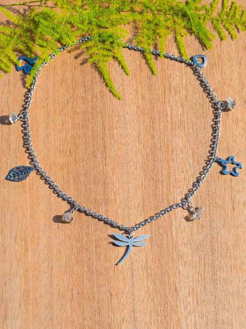 Este colar feminino têm cinco figuras decorativas, nomeadamente um coração, uma estrela do mar, uma libelinha, uma folha e um anjo.
