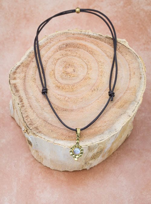 Montado em fio de cabedal castanho, este colar tem dois nós de correr, que permitem ajustar o seu comprimento.