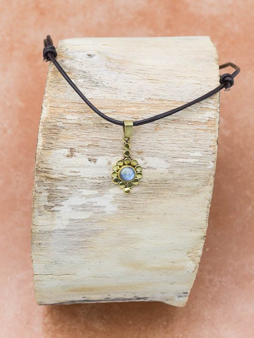 O colar Siyin é concebido com uma peça decorativa, trabalhada artesanalmente, e um cristal natural de Labradorite.
