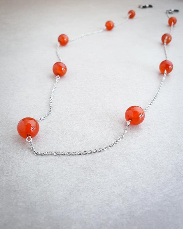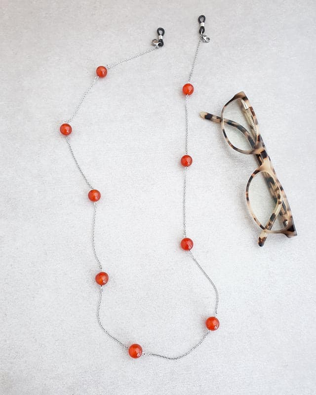 A corrente de óculos Cornalina tem dois fechos laterais, o que permite a sua utilização também como um extensor de máscara ou colar.