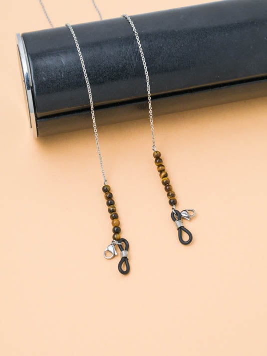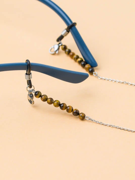 A Corrente para Óculos Olho de Tigre é feita à mão no nosso atelier, com aço inoxidável e cristal natural. Dispõem de duas borrachas de boa qualidade, que são ajustáveis, possibilitando o seu uso com diferentes tipos de óculos.