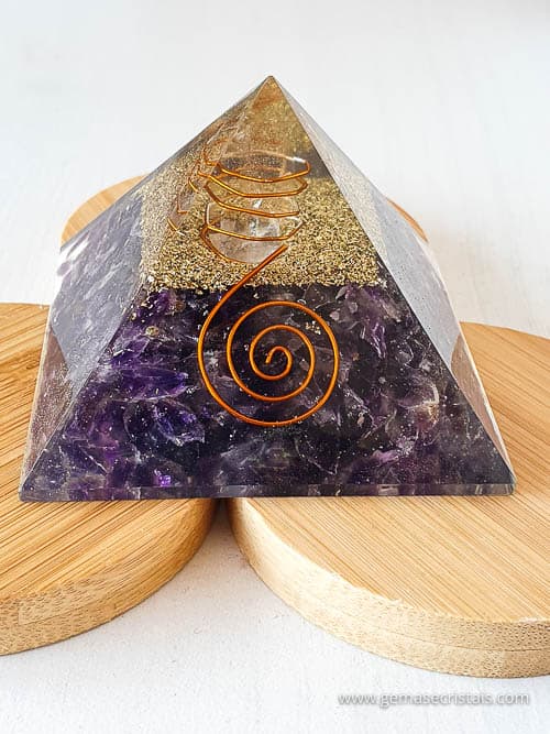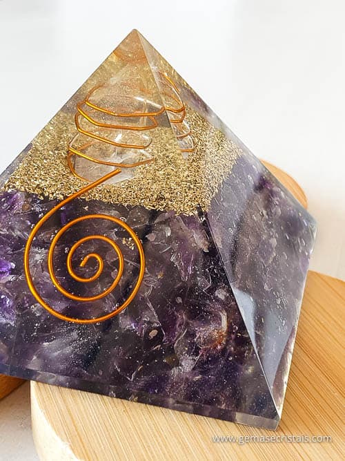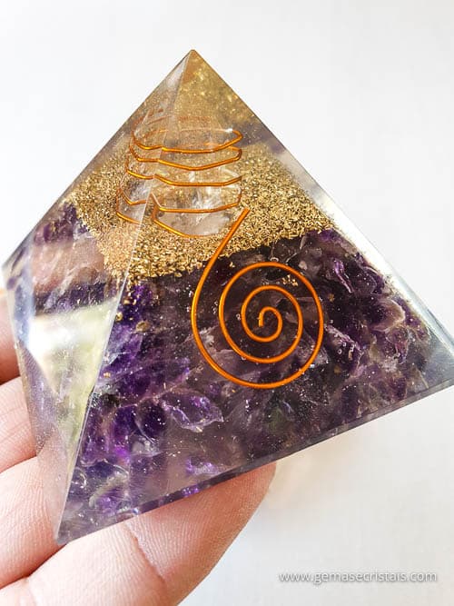 Pirâmide Orgonite de Ametista, concebida artesanalmente com pedras naturais.