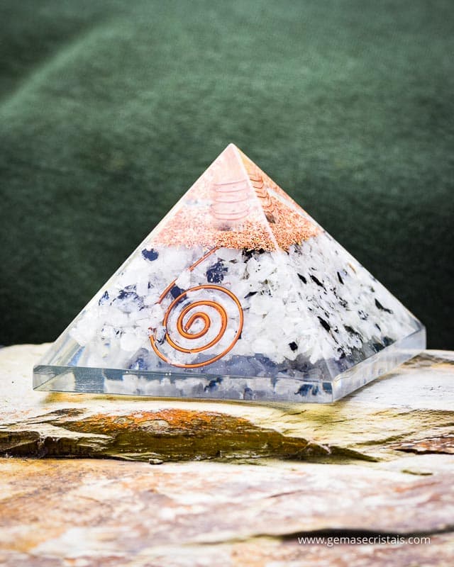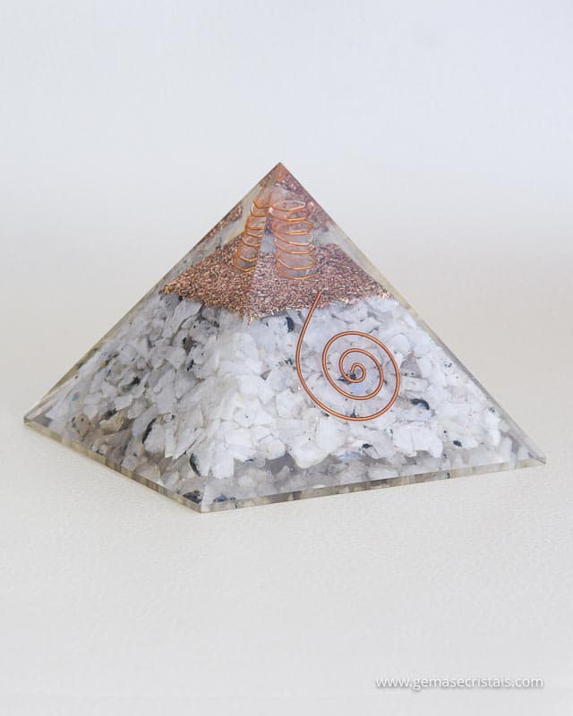 Pirâmide Orgonite de Pedra da Lua, concebida artesanalmente com cristais naturais.