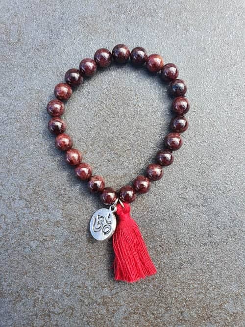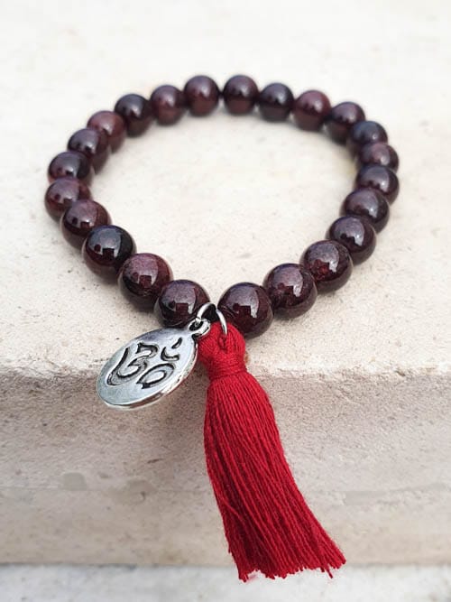 A Pulseira Granada é feita artesanalmente com cristais naturais, pompom e o símbolo Om.